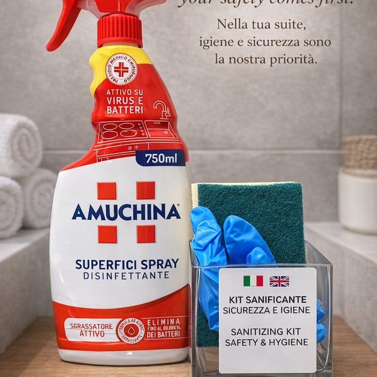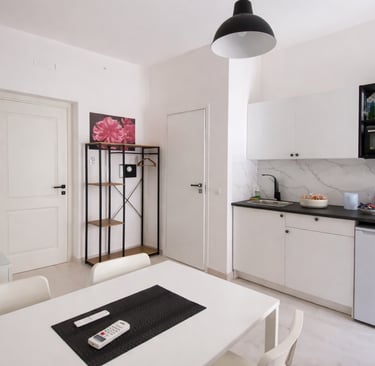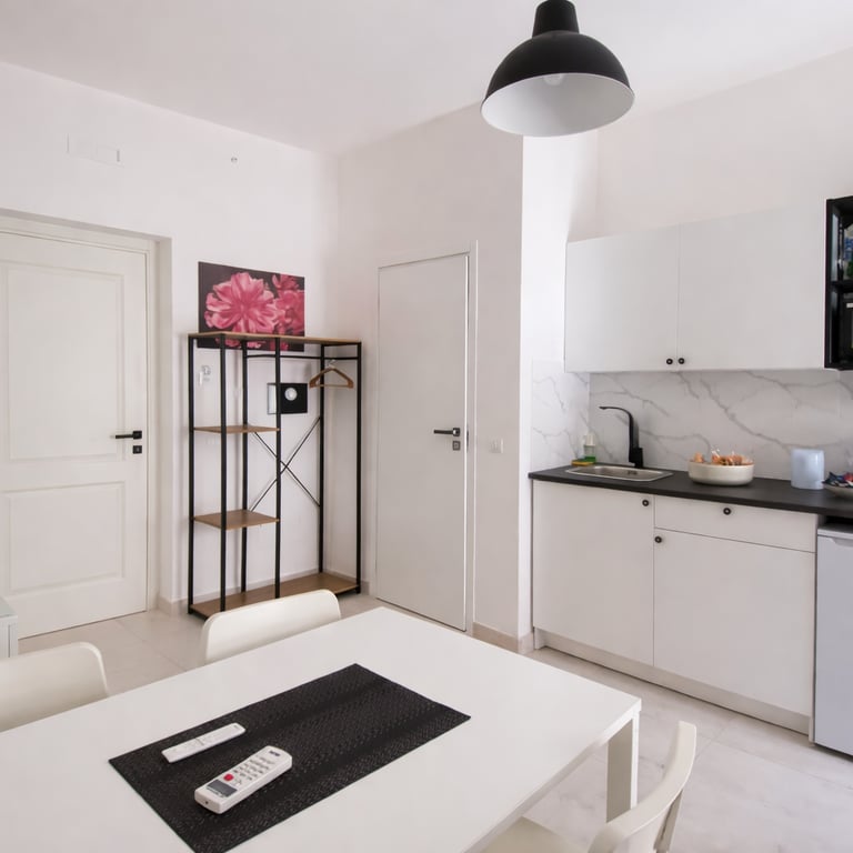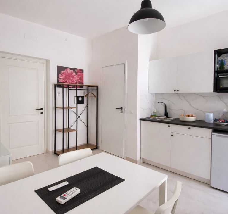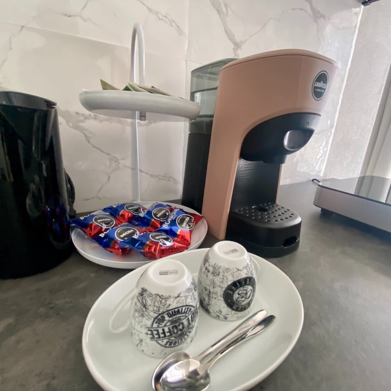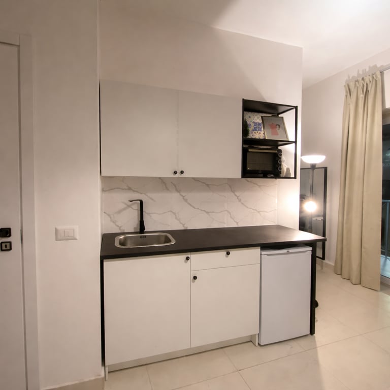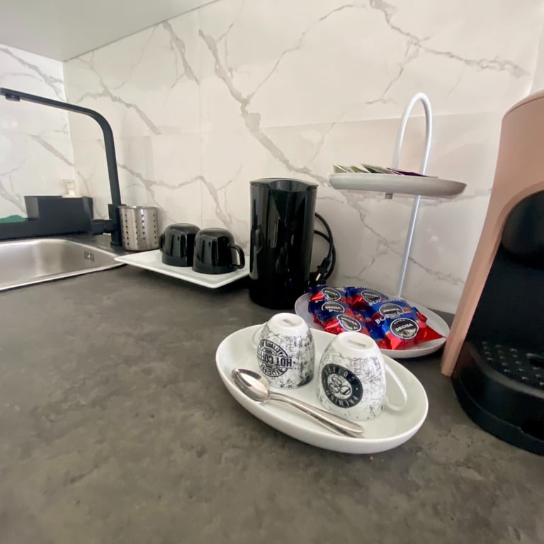 Su richiesta è disponibile un angolo cottura attrezzato con piano cottura singolo, fornetto e macchina caffè/tè (servizio extra a pagamento), ideale per soggiorni più lunghi o per chi desidera maggiore autonomia.