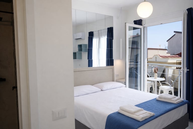 Questa camera matrimoniale deluxe a Cirò Marina centro è perfetta per chi desidera comfort, posizione strategica e un ambiente raffinato, ideale per coppie in cerca di relax e qualità.