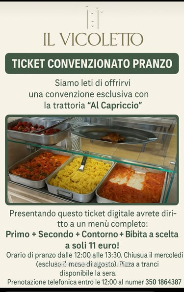 SHOW THE TICKET BELOW AT THE COUNTER TO RECEIVE THE DISCOUNT: LUNCH MENU €11 (FIRST COURSE, SECOND COURSE, SIDE DISH, AND DRINK).