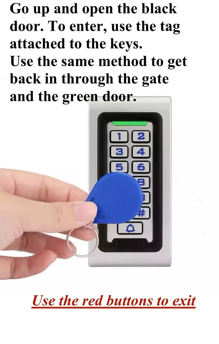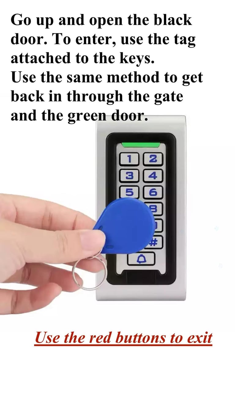 Write to us on WhatsApp: we will remotely open the grey gate and the green door. Enter the reception — you will find it above the wooden bench.